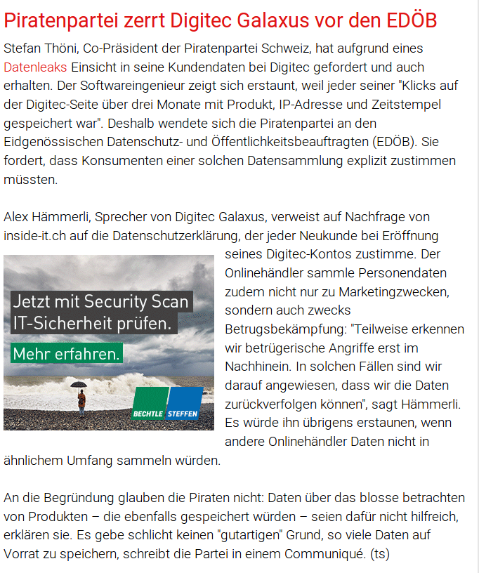Stefan Thöni, Co-Präsident der Piratenpartei Schweiz sagt dazu: «Die Verschlüsselung von Personendaten anderer Menschen bei Übertragung im Internet oder bei Transport per Laptop oder Datenträ...